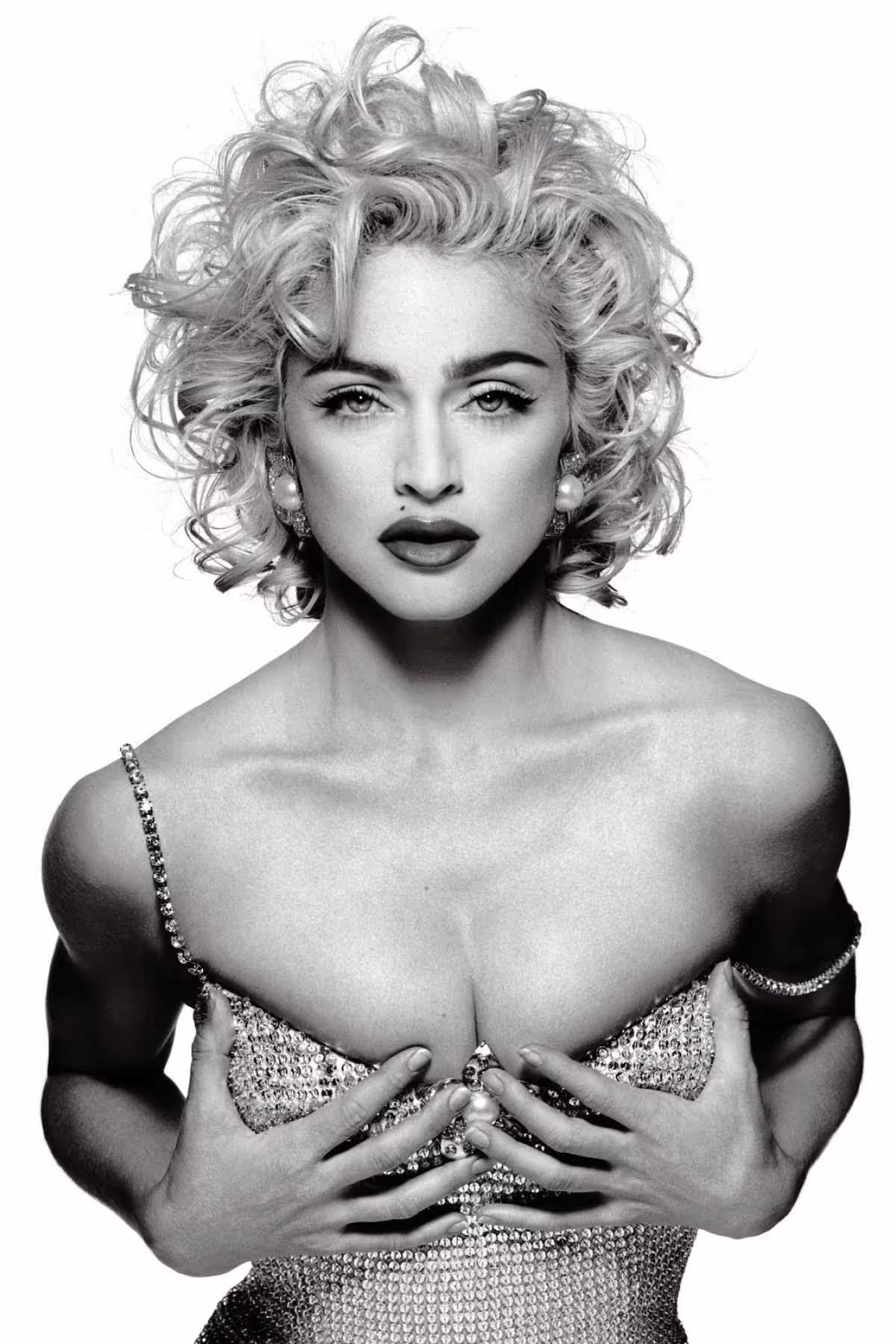 This white slip dress debuted on the Resort 1990 runway, worn sans jacket by British model Gail Elliott, one of Michael’s runway favorites. The simple silhouette is encrusted with hand-embroidered crystals to create a luminous, textural effect. For the anniversary collection, the dress was styled on model Bella Hadid with a sleek, tailored tuxedo jacket draped over her shoulders. This sought-after slip dress was featured on countless magazine covers throughout the 1990 holiday season and stole the spotlight in a legendary portrait of Madonna as Glamour magazine’s Woman of the Year. (A photograph that Michael now owns and passes in his hallway every day.)